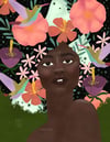 Mother Earth artwork by Mervi Eskelinen, ready to download and print. A digital artwork of a beautiful Black woman with hair containing flowers and paradise birds. She is the nature, she is the mother, she is everything.